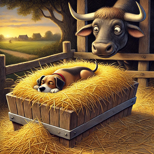 فِي يَوْمٍ مِنَ الأَيَّامِ، أَضْنَى الكَلْبَ تَعَبُ النَّهَارِ وَشَقَاءُ السَّعْيِ، فَالْتَفَتَ إِلَى الرَّاحَةِ مُبْتَغِيًا هَنَاءَ القَيْلُولَةِ، فَإِذَا بِهِ يَرْمُقُ مِذْوَدَ الثَّوْرِ بِعَيْنٍ طَامِعَةٍ، وَيَرْتَئِي أَنْ يَجْعَلَهُ فِرَاشًا دَافِئًا. فَمَا إِنْ دَخَلَ المِذْوَدَ حَتَّى ارْتَمَى عَلَى التِّبْنِ الهَنِيءِ، يَفْتَرِشُ دِفْءَ الشَّمْسِ المُتَسَلِّلَةِ إِلَيْهِ، مُسْتَأْنِسًا بِسَكِينَةِ المَكَانِ وَمُبْتَعِدًا عَنْ ضَجِيجِ العَالَمِ الخَارِجِيِّ.